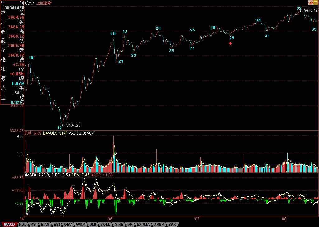 有人可能又要问,怎么总是说1分钟的图?其实,看什么图并不重要,从1分钟图看起,只不过意味着这分析的基础有一个1分钟图的精度前提,在这个前提下,当然要看1分钟的图,而这不影响对大级别的分析。例如,1-19,就构成一个5分钟的走势类型,而这走势,最终确认并没有形成两个5分钟的中枢,所以只能算是一个盘整。而从19开始到45,由于41低于32,所以这走势至少有一个5分钟的中枢,但这新的5分钟走势类型并没有最终完成。