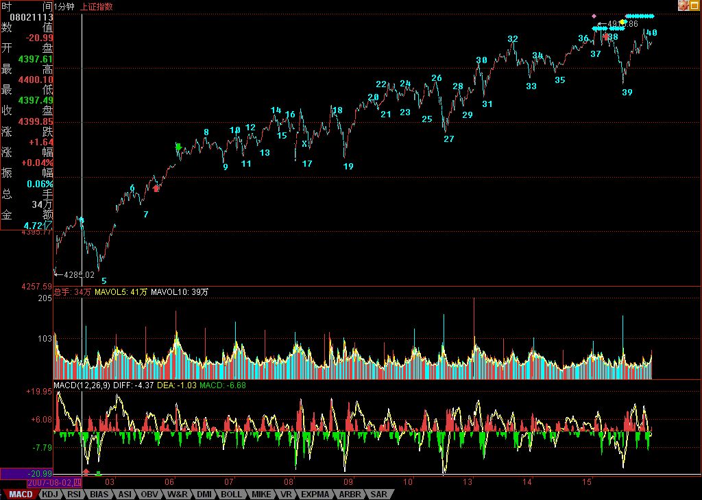 例如,到今天,走势一种最明显的划分已经自动走出来,就是8-17构成5分钟中枢,该中枢是4300点那个5分钟中枢上来后的一个新的5分钟中枢,这个中枢,在刚形成时,我们已经指出,而且任何学过本ID理论的,都可以当下指出。一般来说,形成这个5分钟中枢后,在理论上只有三种走势: