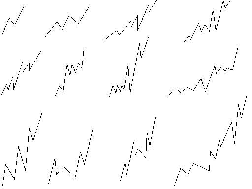 请各位看看下图,里面有12种走势,其中每种走势中的每一划都代表实际走势中的一笔,请问,里面构成一线段走势的有多少种?换一种问法,就是有多少个图是不构成一线段,有多少个图刚好是一线段,有多少个至少是2个线段的连接?