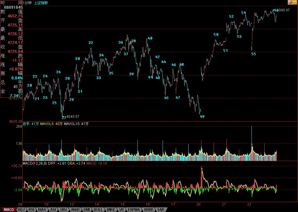一般来说,1分钟线段都不会延续这么长时间,能延续这么长时间,反而是一个技术上的重要提示,证明多方上5000点的冲动比较大,反复闹,而上面,有人不断压制,所以才会走出向上倾斜三角型的走势。而到尾盘,差不到一点见5000了,多方一股真气突然泻去,回到倾斜三角形起点位置。主要是如530般在亢奋状态突然被惊吓留下了后遗症,因此往往在关键时刻都来这么一下,尾盘收回去一半,只是表明多头上攻的欲望依然没得到满足,如此而已。