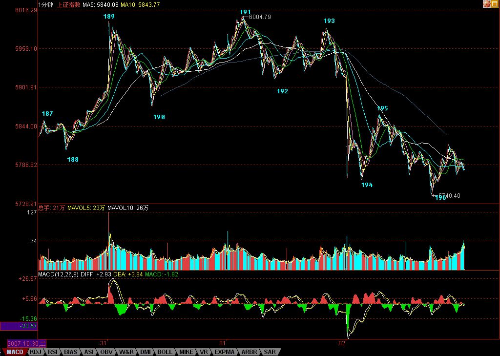 当然,操作上第一个中枢的第三类卖点在该级别中是最后的走人机会,后面的都没意义了,也就是说,对于这次调整的逃避,191是第一类卖点,因为前面线段类上涨走势出现类背驰,而193是第二类卖点,因为站在线段的角度,就是第二类卖点,而站在189-192的1分钟中枢震荡的角度,任何的次级别离开,都将先构成卖点,然后再考虑是否回跌形成第三类买点的回补机会,这是中枢震荡的操作方法。