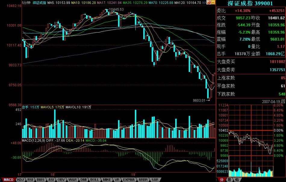对于一个跌破中枢的下跌来说,第三类卖点后再来两波就可以随时完美。这个完美,由于该下跌是1分钟以下级别的,因此从该下跌的细部,是找不到根据1分钟背弛去确认的买点的,只可能根据分笔背驰。而根据预先知道的中枢震荡看法,唯一需要确认的是,1330后的下跌与1030前下跌的力度比较。从5分钟MACD两柱子面积的比较可以看到,前者并不比后者的力度大,这一点,参考看深圳成指的图就更明显了(请看下图)。所以,可以断言,这1330开始的下跌,一定会有强力回拉。