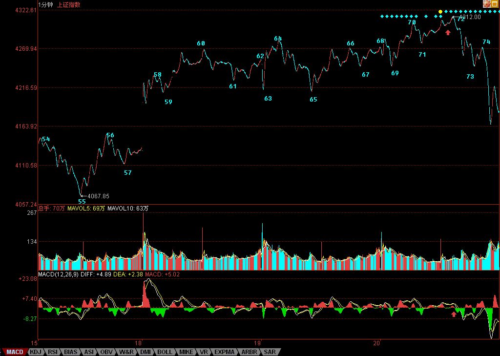 对于60-69这个5分钟中枢,69的4244点是一个关键位置,如果在其下出现第三类卖点,那么走势至少将扩展成一个30分钟中枢,调整的幅度与压力就大了。而对于72开始的走势,73很重要,要重新走强,必须冲破73这一点,该点位置恰好也是4244点。因此,短线的4244点十分关键,重新站稳,则大盘将最多是5分钟中枢的延伸震荡,否则即使不演化成5分钟级别的下跌,也将扩展成30分钟级别的中枢震荡。
