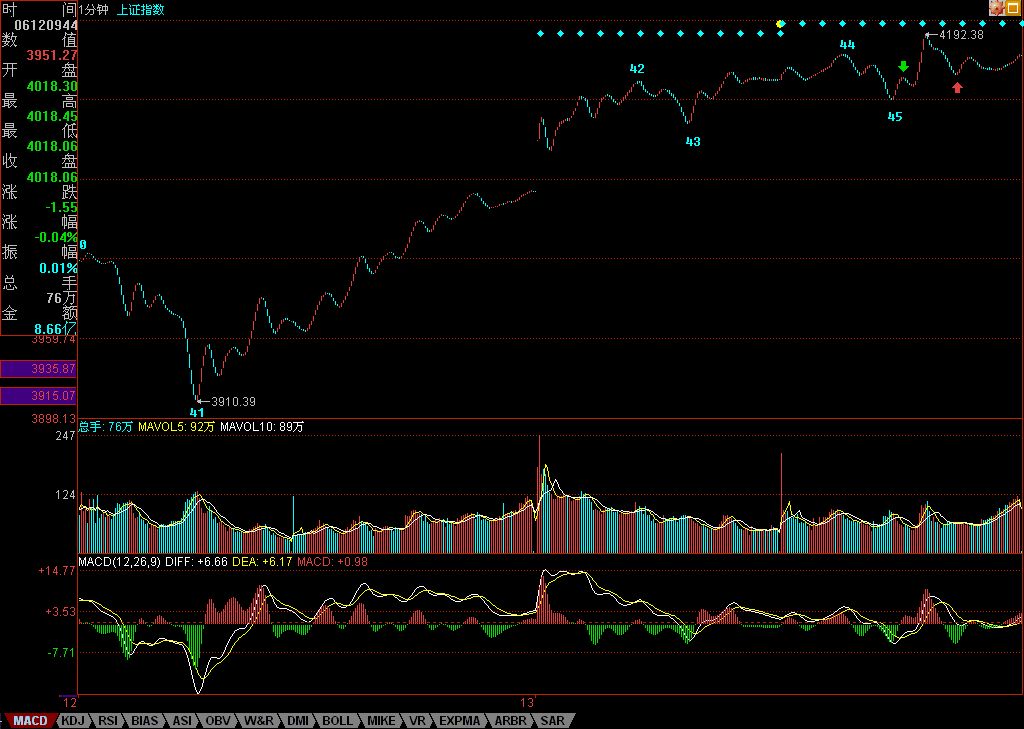 今天的走势没什么可讲的,昨天都已经描述得很清楚了。技术、心理、政策等压力,都需要在这里震荡消化。由于今天没完全补上缺口,因此该位置依然是短线的关键,当然,上面说的42-45的1分钟中枢,已经延伸9段,成为一个5分钟中枢了,后面具体的分析,在上面的文章里已经写了,就不再多说。深圳受到13700点的吸引,短线,能否站稳该线对大盘走向有极大的引导作用。