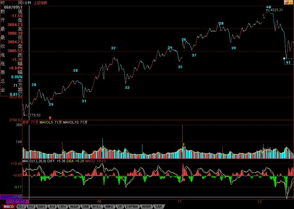 有人可能又要问,怎么总是说1分钟的图?其实,看什么图并不重要,从1分钟图看起,只不过意味着这分析的基础有一个1分钟图的精度前提,在这个前提下,当然要看1分钟的图,而这不影响对大级别的分析。例如,1-19,就构成一个5分钟的走势类型,而这走势,最终确认并没有形成两个5分钟的中枢,所以只能算是一个盘整。而从19开始到45,由于41低于32,所以这走势至少有一个5分钟的中枢,但这新的5分钟走势类型并没有最终完成。
