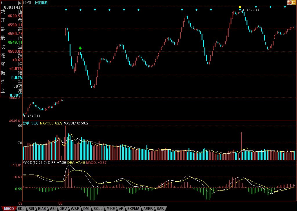 那么,这样的分歧,究竟有多细微的程度,各位可以看下图。关键是绿箭头指着的两个K线,第一根范围是[4594.91,4597.57],第二根范围是[4595.19,4597.44],由于第一根是最高收的,而4597.57与4597.44相差极为细微,所以可能就是0.1秒的数据收集差异,就导致在同花顺中的包含关系,在别的软件中就是第二根的高点比第一根的高一点点,就不是包含关系了,第二根才是分型的顶,这样,笔自然就成立了。如果这里的笔成立,那么整个分段就有一定的变化了。不过,这并不实质影响整个走势的分析,由于各位也应该明白,为什么在实际的分类中,必须要从分型和笔开始,最后由线段构成最小级别的中枢,其中一个原因,就是这样,到了最小级别的中枢的层次,这种微小测量误差造成的差异就可以尽量地抹平了。而到了更大级别的中枢,这些就不再存在。当然,这不是分型、笔、线段的主要功用,但也是其中之一。