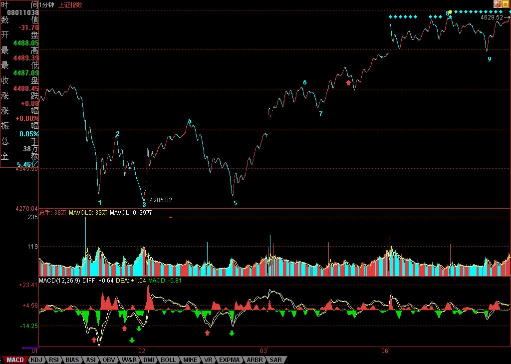 短线走势,看看下图就很明白,8-9形成的线段,和下面6-7的形成线段上类上涨走势,当然,这个走势可以延续下去,直到形成新的1分钟中枢,但前提是后面的上攻不形成类背驰,否则,将至少在目前位置形成一个1分钟级别的中枢震荡。是否背驰,就是明后两天关注的重点。一旦背驰形成,那么一个大的震荡不可避免。