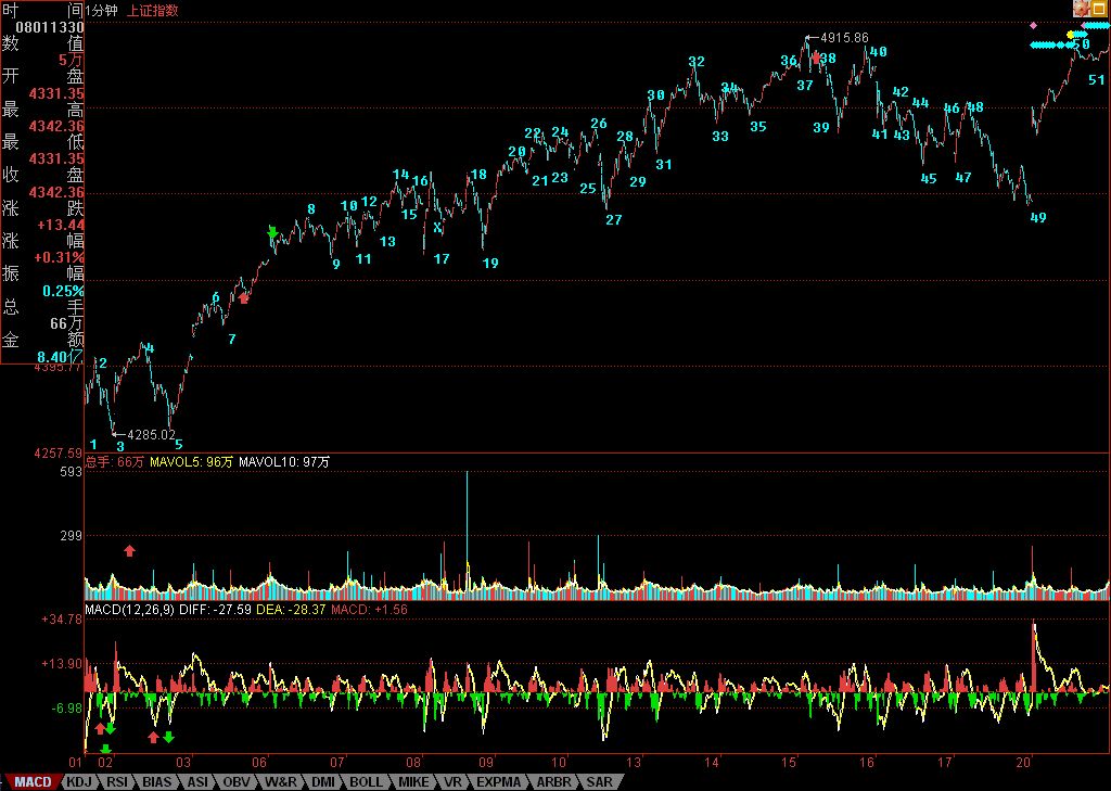 下图里的8-49可以看成是一个30分钟中枢,但更可以看成是,对于8-17这个5分钟中枢,17-38的1分钟走势5分钟背驰后,必须有一个回拉至少回到8-17这个5分钟中枢里。显然,49已经跌破14,十分完美地演绎了本ID的理论。超短线的角度,根据走势的多义性,可以把后面的走势先看成是32-41这个5分钟中枢的一个震荡,要往上突破,就要出现第三类买点,否则,别看今天涨了248点,依然只是中枢震荡。