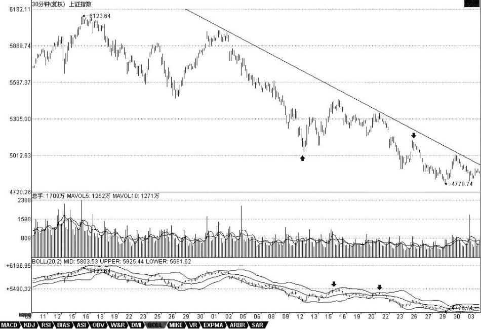 注意,用这个指标有一个很好的辅助判断第二类买卖点,有时候也可以用来判断第一类买卖点。一般来说,从上轨上跌回其下或从下轨下涨回其上,都是从超强区域转向一般性区域,这时候,如果再次的上涨或回跌创出新高或新低但不能重新有效回到超强区域,那么就意味着进入中阴状态了,也就是第一类买卖点出现了。